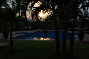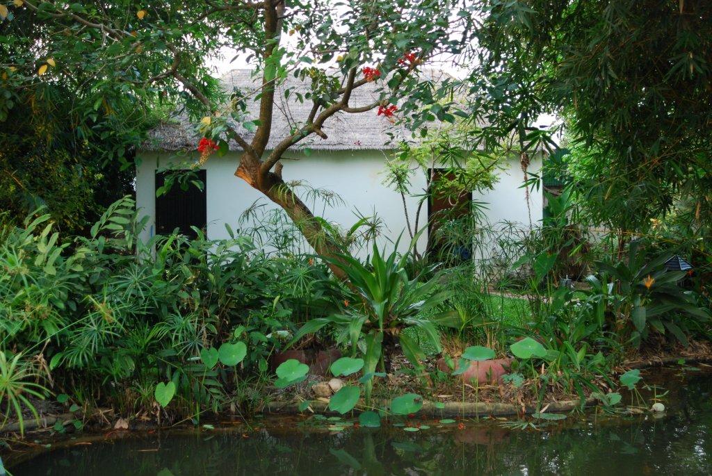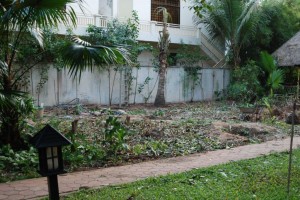 Day 2 is done and we had tears. This morning, since most of the trees are now chopped down, we could plot out the buildings…cue tears! The buildings were way too close together and we felt that our guests eating breakfast would have a nice view of guests in the new rooms – not ideal! One of the things all our guests comment on is what an oasis Journeys Within is and we don’t want these new buildings to ruin that feel. So I cried, and then Brandon found a solution (it really does work every time!). We have decided to take down the pump room and staff room and relocate them and our new rooms will go here, nestled behind the pond and next to, but not on top of, our original rooms. The pump room will fit well in the corner behind Ramayana Retreat and we are going to put the staff room closer to the house so it will be better for everyone. While this will of course add to the budget, it isn’t too much and I think having the restaurant and rooms not looking directly at each other will be great. Here’s where we’ll be adding our new bungalows….