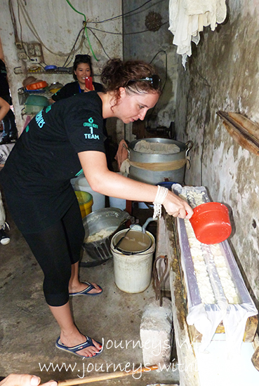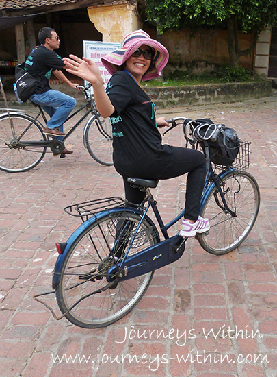 Our amazing Northern Vietnam Tours Manager Ms. Tracy getting to grips with her bike.Enjoying a scenic cycle with the guides outside of Hanoi in Duong Lam village.Soaking up the atmosphere at Mia Pagoda as a nun begins her chanting for the Vu Lan Festival, in Duong Lam village.Anna learns how to make tofu.Enjoying a well-earned lunch at Mr, Huyen’s house. Over 200 years old, the house is one of the oldest in the village.Yum! Next stop central Vietnam.