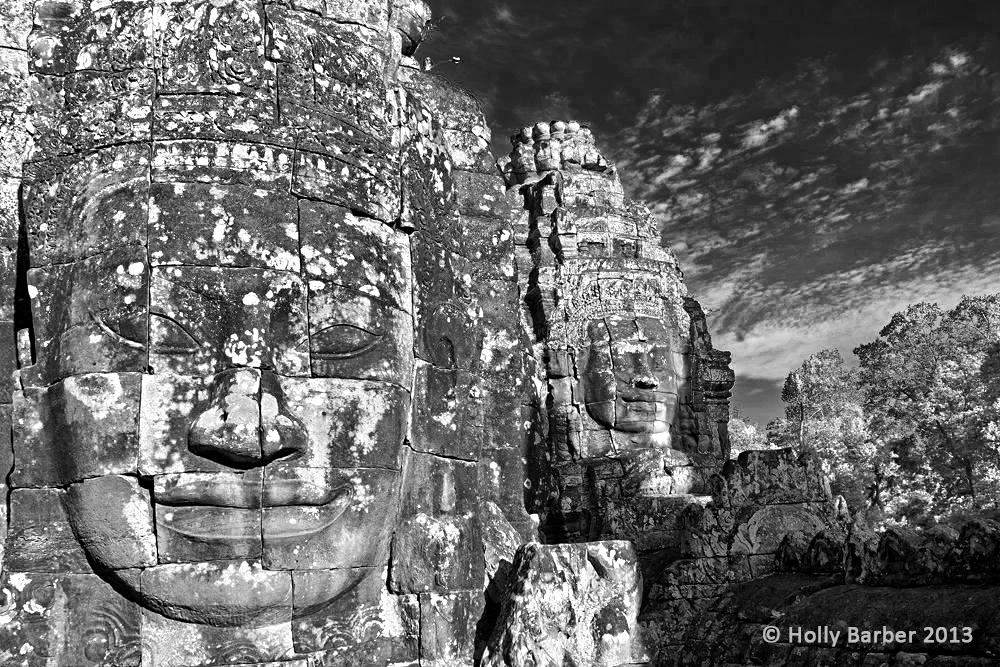 The photo above of The Bayon temple in Cambodia’s Angkor Park was taken as a colour image and converted to B&W in Adobe Photoshop. Removing the colour from the picture works well in this particular image as it focuses attention on the form and texture of the stone faces and brings out the clouds in the sky.
