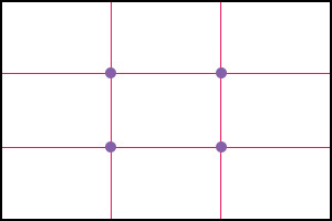 In the diagram above, the lines and points of intersection for the rule of thirds are shown. The strongest composition will result from the image’s main subject being placed on or near one of the purple dots.