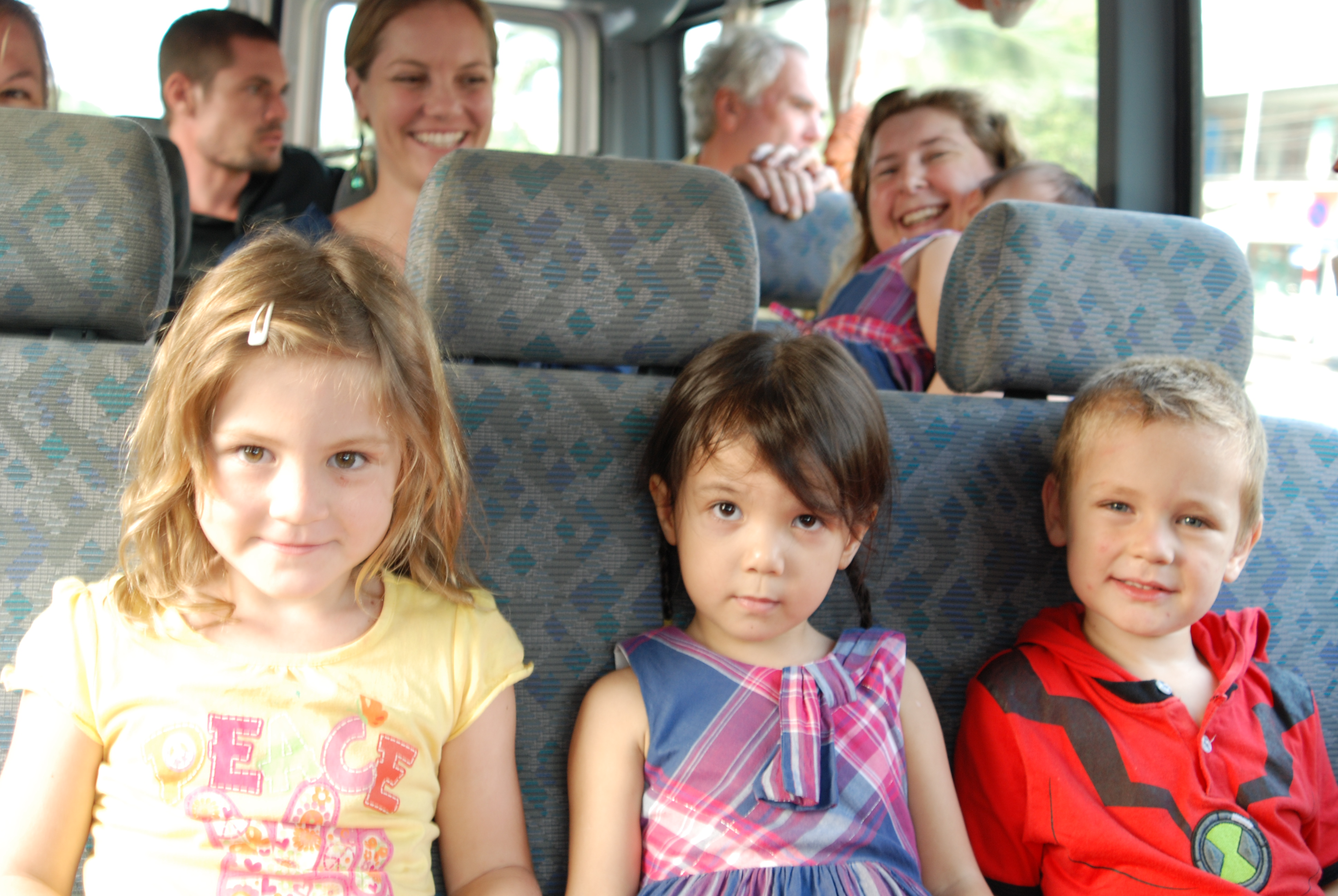 Callie, Rosie and Couper in the bus on tour in Vietnam