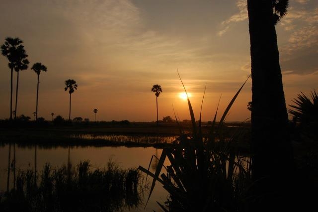 The sun sets into the flooded rice patties in Siem Reap, Cambodia